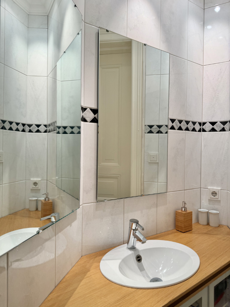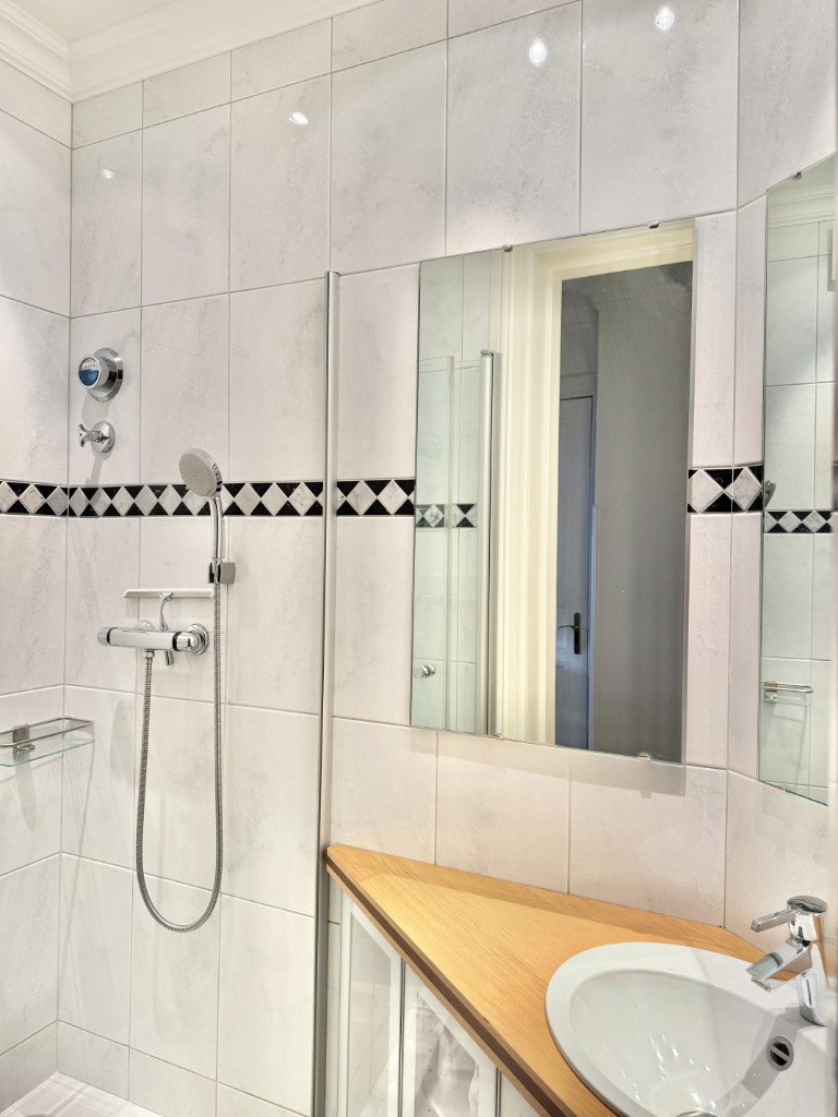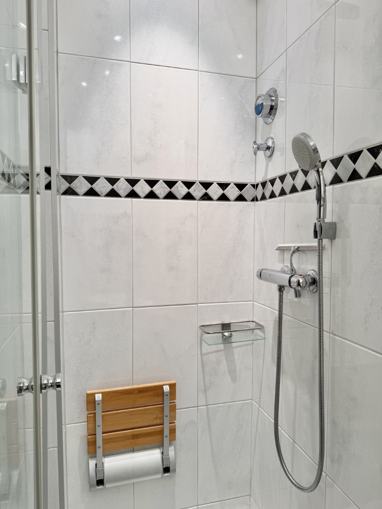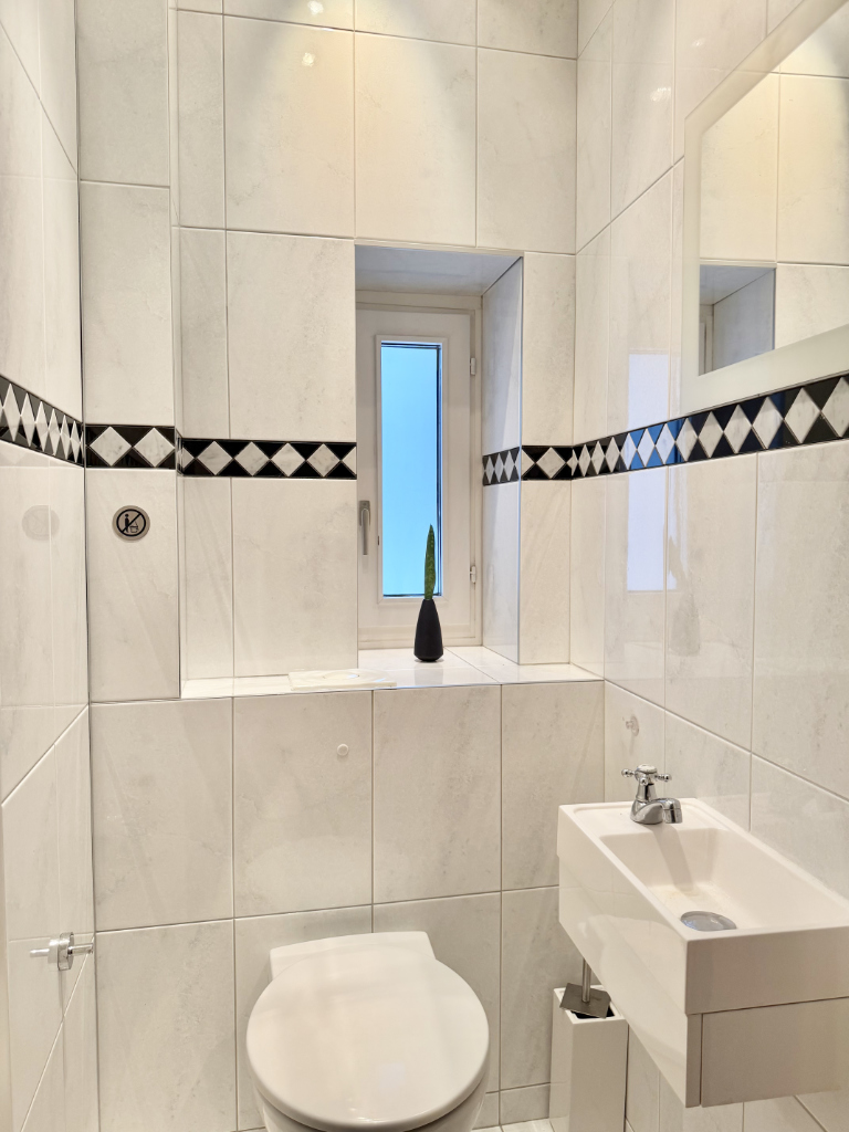 Daneben befindet sich das moderne WC. Hier wurde gekonnt die Brücke geschlagen zwischen klassischem und modernem Design. Ein kleines Fenster lässt Tageslicht und frische Luft hinein. Dem WC gegenüber ist das ebenfalls modere Duschbad im gleichen Design. Deckeneinbaustrahler leuchten dieses geschickt eingerichtete Duschbad aus und reflektieren in der Glasabtrennung und dem Spiegel über dem diagonal maßgefertigten Waschtisch.