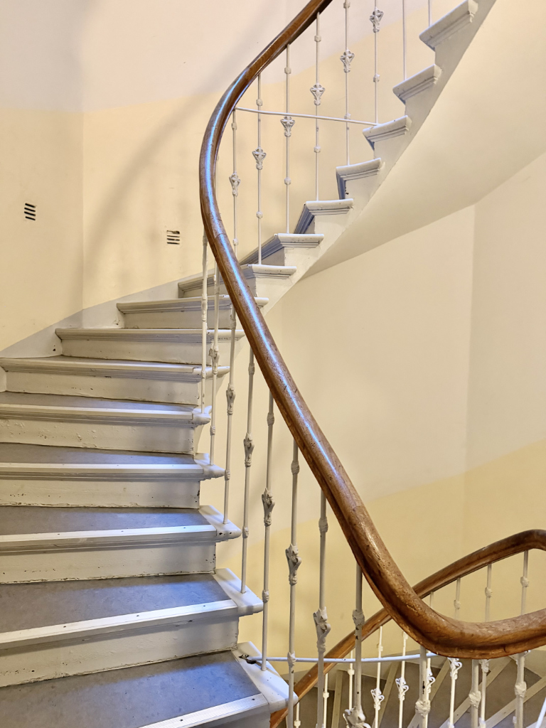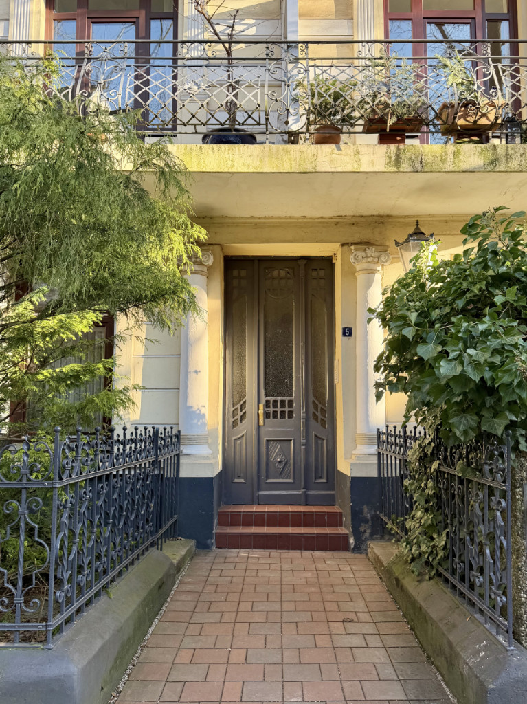 Zwei imposante Säulen zieren die massive Hauseingangstür des cremegelb/ziegelroten Hauses. Stuckleisten im Jugendstil schmücken die Wände des Treppenhauses, in dem sich eine geschwungene Treppe elegant in die oberen Etagen windet.