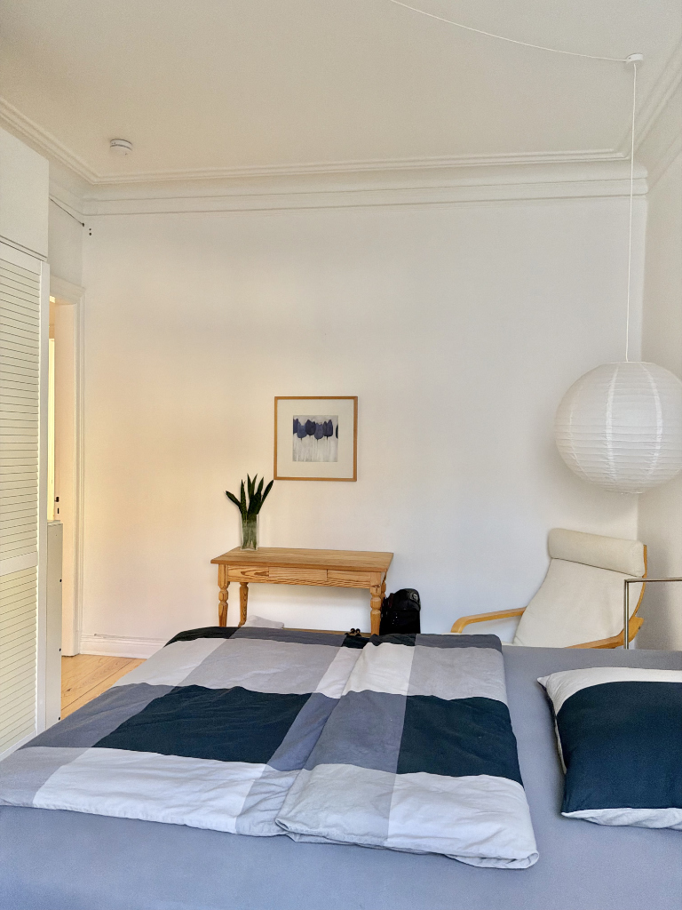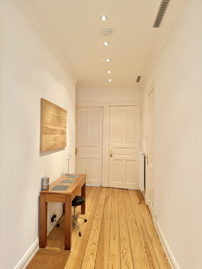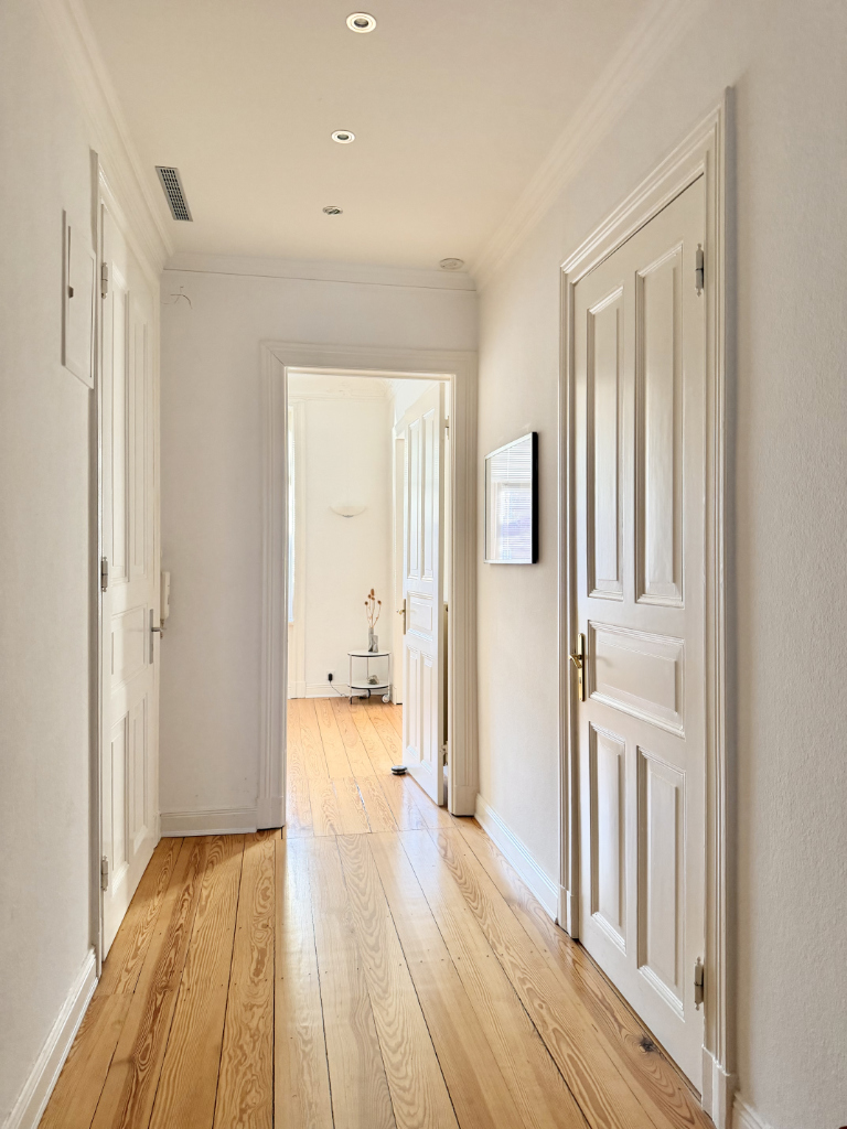 Die schöne Wohnung befindet sich in der 2. Etage und erstreckt sich über die ganze Tiefe der Gebäudehälfte. Sie empfängt ihre Gäste in einem durch Einbaustrahler erhellten Flur mit klassischen Massivholzdielen und hohen weißen Zimmertüren mit Jugendstilelementen.