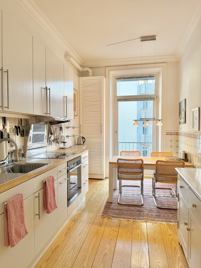 Die Küche ist mit einer hellen Einbauküche ausgestattet und bietet ausreichend Platz für einen zusätzlichen Essbereich. Von hier gelangt man auf den Balkon zum Innenhof mit Büschen und Bäumen, die im Sommer durch das Rauschen der Blätter und Vogelgezwitscher eine entspannende Atmosphäre bereiten.