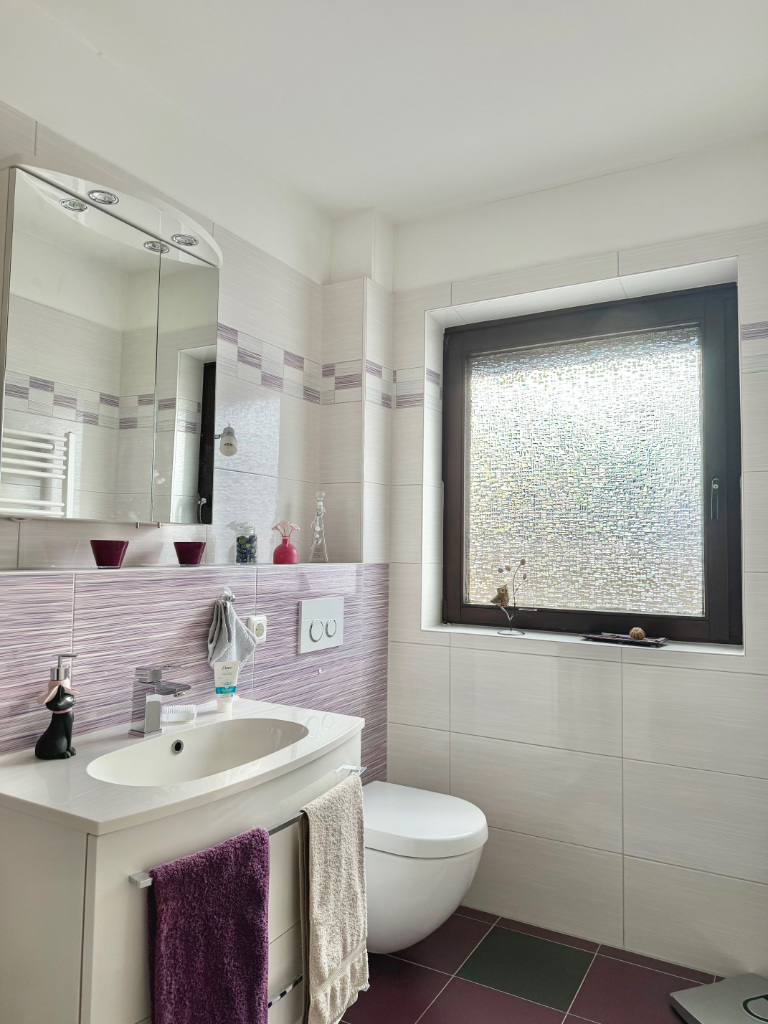 Rechts führt der Flur in das Badezimmer. Es verfügt über eine Badewanne, einen eleganten Waschtisch und ein Fenster für angenehmes Tageslicht und frische Luft nach einem heißen Bad. Eine Handtuchheizkörper hält ein warmes Badetuch bereit. Besonders schön an diesem Badezimmer ist die Farbwahl. Weiße Wandfliesen mit Akzenten in einem warmen Beerenlila und perfekt darauf abgestimmten Bodenfliesen verleihen ein wohliges Gefühl.