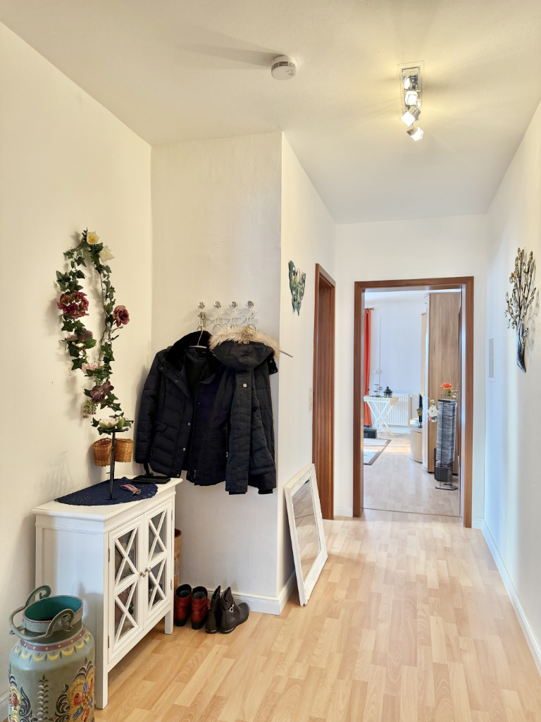 Die gut geschnittene Zweizimmerwohnung liegt im Erdgeschoss links, mit süd-westlicher Ausrichtung. Vom Wohnungseingang gelangt man in einen geräumigen Flur mit einem pflegeleichten Bodenbelag, der auch mal typisch norddeutsches Schmuddelwetter verträgt.