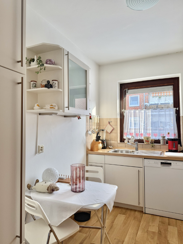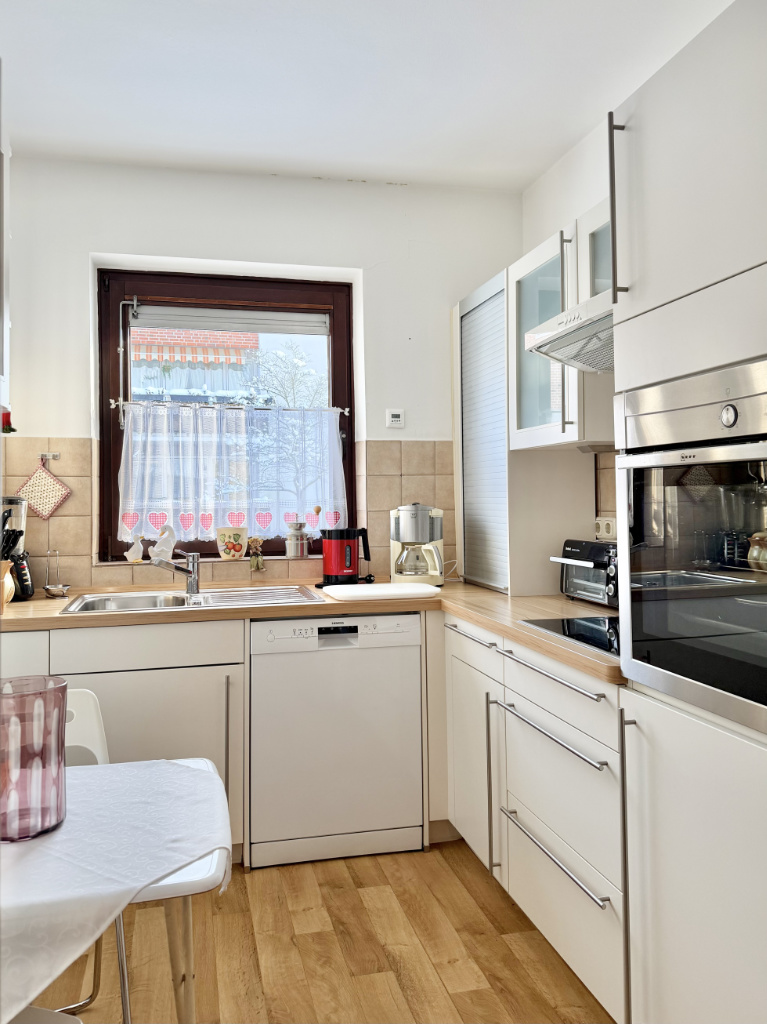 Dem Eingang am nächsten ist die Küche mit Blick in den Vorgarten. Sie ist mit einer weißen Einbauküche ausgestattet und verfügt über Markeneinbaugeräte. Die Arbeitsplatte in Holzoptik ist farblich harmonisch auf den Bodenbelag abgestimmt.