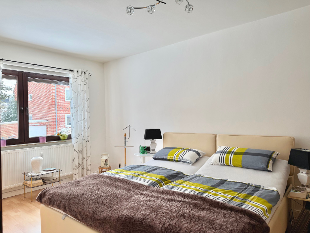 Geradeaus geht es in das Schlafzimmer mit viel Platz für einen großen Kleiderschrank und dekorative Kleinmöbel.