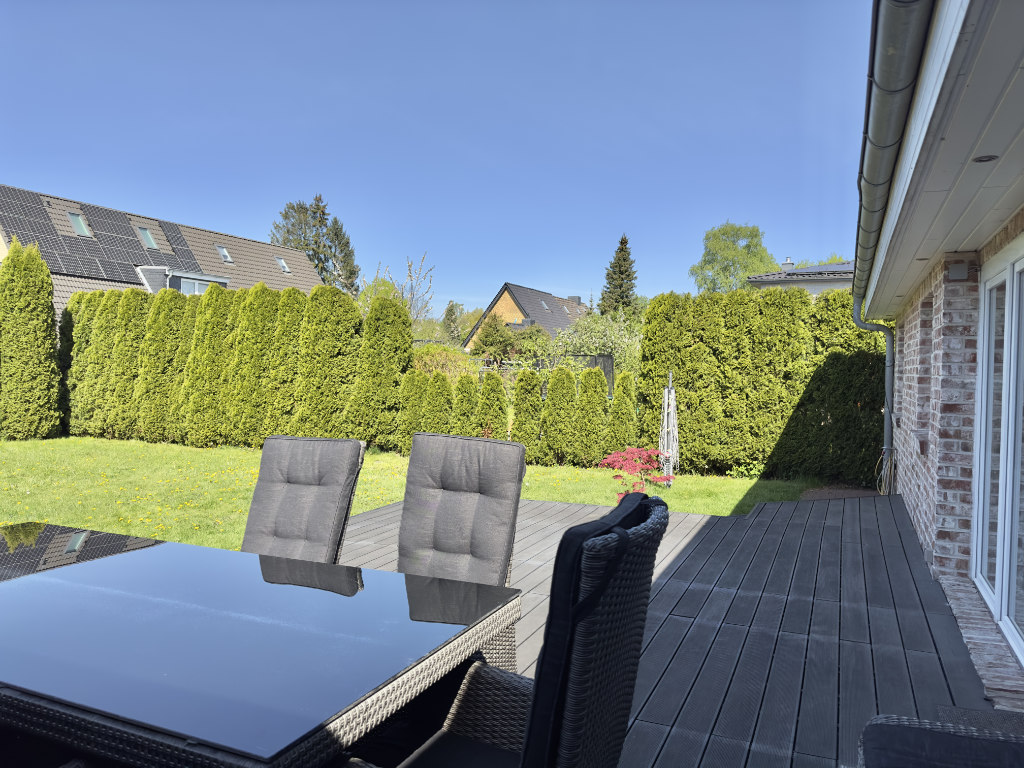 Bodentief verglaste Fenster- und Türelemente lassen in diesen eindrucksvollen Raum angenehmes Tageslicht einfallen und gewähren den Zugang zur wohnlichen West-Terrasse sowie dem pflegeleichten, nahezu uneinsehbaren Garten. Ein idealer Ort die Freizeit mit Grillen, toben, lachen und Seele baumeln lassen zu verbringen.