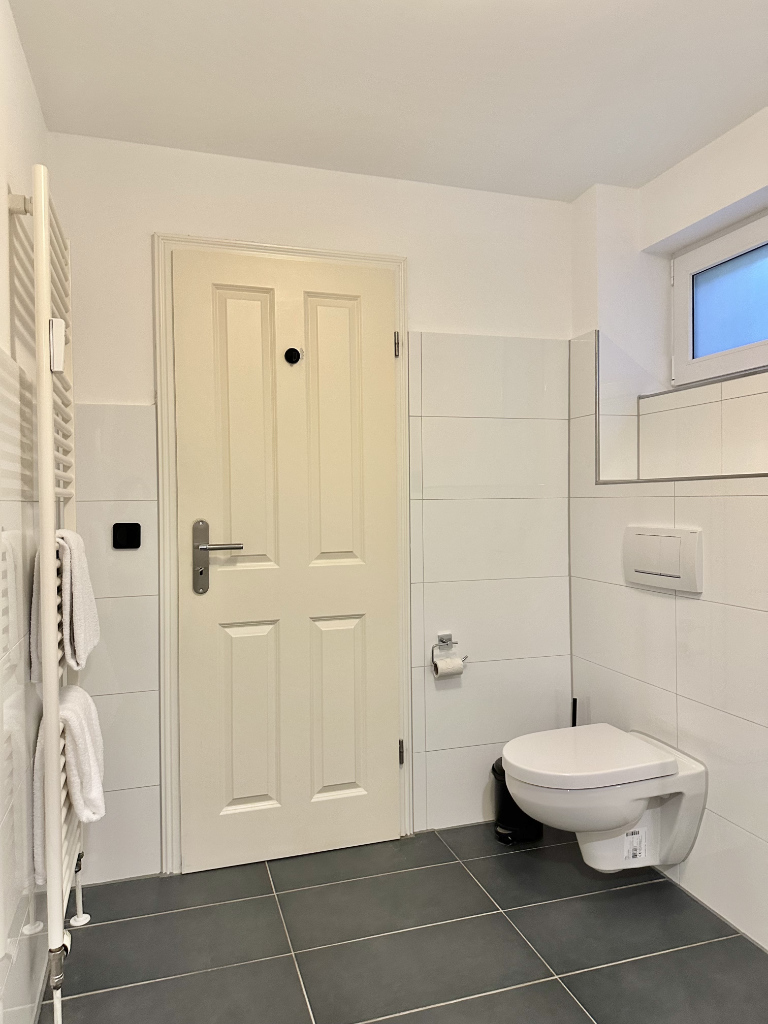 Von hier ist zudem das Badezimmer erreichbar. Es ist wie das Gäste-WC modern in Weißund Anthrazit gefliest. Besonders schön ist die große ebenerdige Dusche mit Glasabtrennung sowie die diversen Ablageflächen.