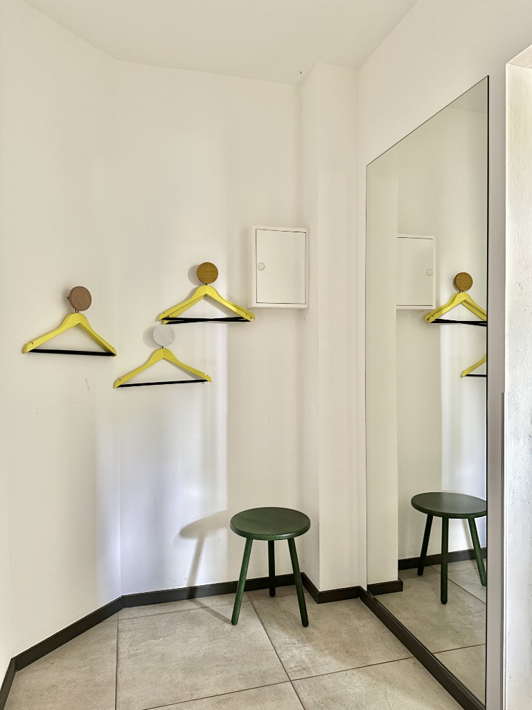Vom Eingang gelangt man in eine Diele mit einer praktischen Garderobe sowie dem Zugang zum weißgefliesten Gäste-WC.