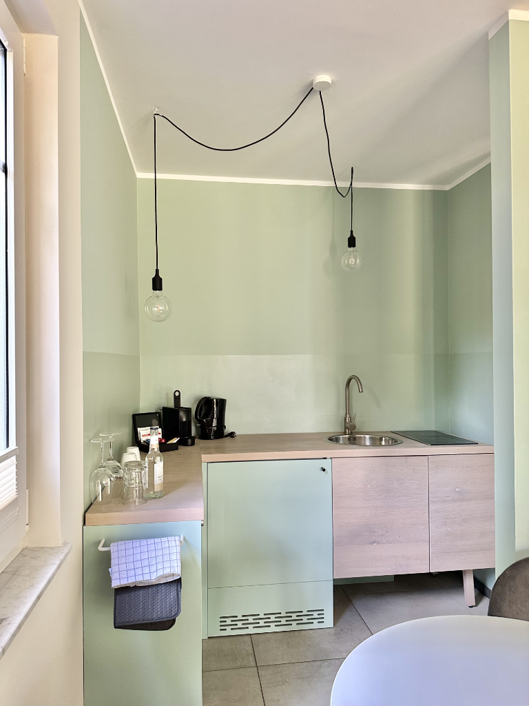 – offene Teeküche mit Spüle, Mikrowelle, Kühlschrank und Cerankochfeld