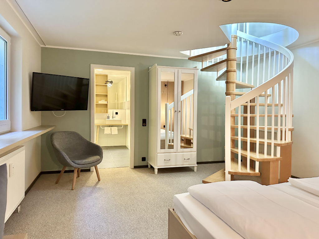 Eine Wendeltreppe in wertigem Echtholz, kombiniert mit weißem Handlauf und Geländer, führt vom Wohnzimmer in das Souterrain mit Schlafzimmer und Bad.