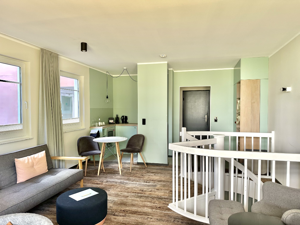 Geradeaus geht es in das große Wohnzimmer mit einem Kochbereich, der für Frühstück und die kleine Mahlzeit zwischendurch mehr als ausreichend ist.