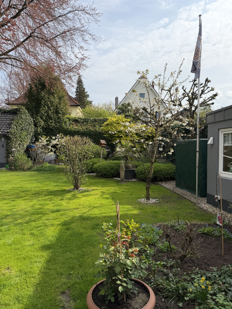 Besonders schön ist, dass der Wohnbereich mit dem Esszimmer und dem Arbeitszimmer verbunden ist. Dies vermittelt ein außerordentlich angenehmes Raumgefühlt. Der Kaminofen im Wohnbereich verleiht diesen Räumen zusätzlich eine behagliche Atmosphäre. Bei Bedarf trennen zwei große Flügeltüren den schönen Wohnbereich vom Esszimmer mit Zugang zur großen Terrasse. Der Garten mit dem schönen Teich lädt zum Entspannen ein.
