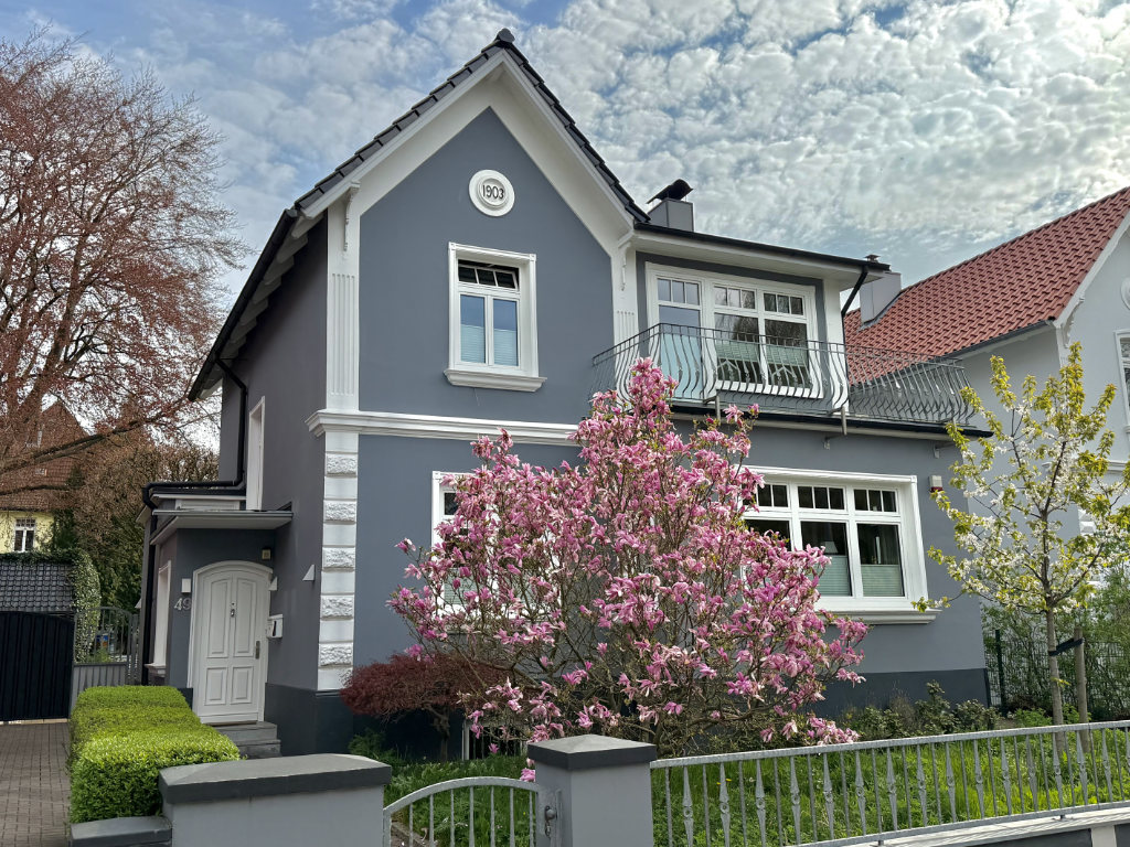 Die graue Villa verfügt über ca. 135 m2 Wohnfläche. Sie lässt an hohem Wohnkomfort keine Wünsche offen. Hier wurden geschickt und liebevoll klassische und moderne Elemente kombiniert. Original Zimmertüren und Stuckelemente im Jugendstil prägen das Antlitz dieser exklusiven Villa.