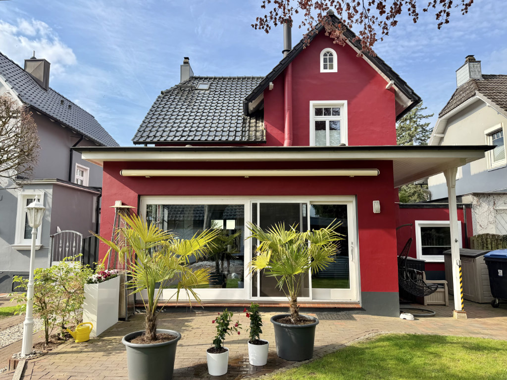 Die rote Villa verfügt über ca. 146 m2 Wohnfläche. Im Erdgeschoss befinden sich die Küche, ein Arbeitszimmer, eine Garderobe und ein Gäste-WC. Zwei weitere Räume sind mit dem großen Wintergarten verbunden. Bei behaglichem Kaminfeuer kann man hier durch die breite Fensterfront den Blick in den gepflegten Garten genießen.