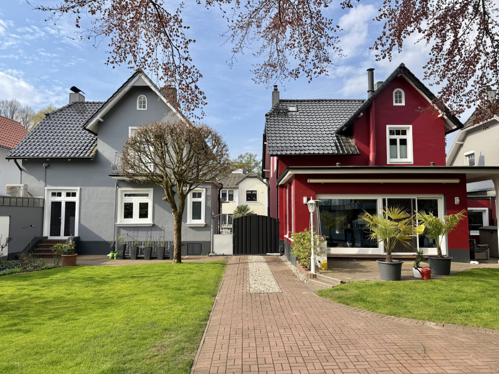 Der Eigentümer nutzt derzeit die graue Villa zum Wohnen und die benachbarte rote Villa zum Arbeiten. Beide Villen sind in einem sehr gepflegten und repräsentativen Zustand.