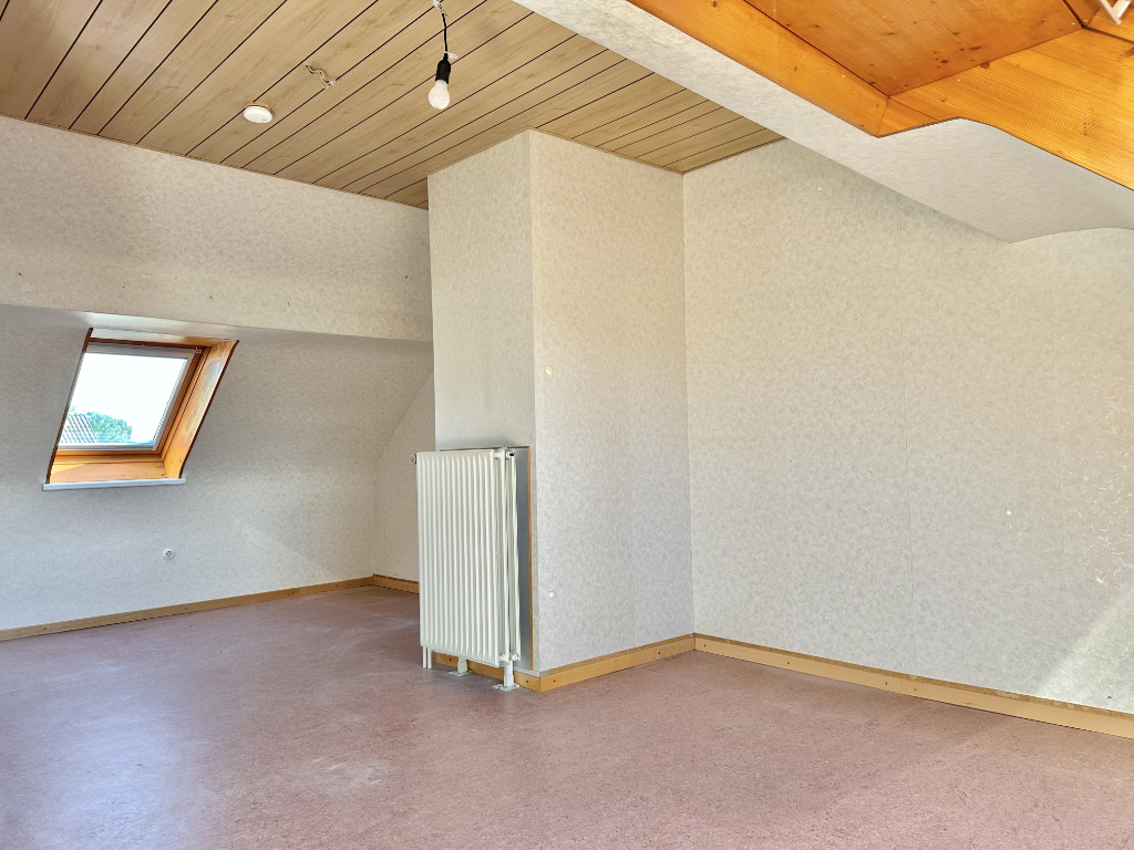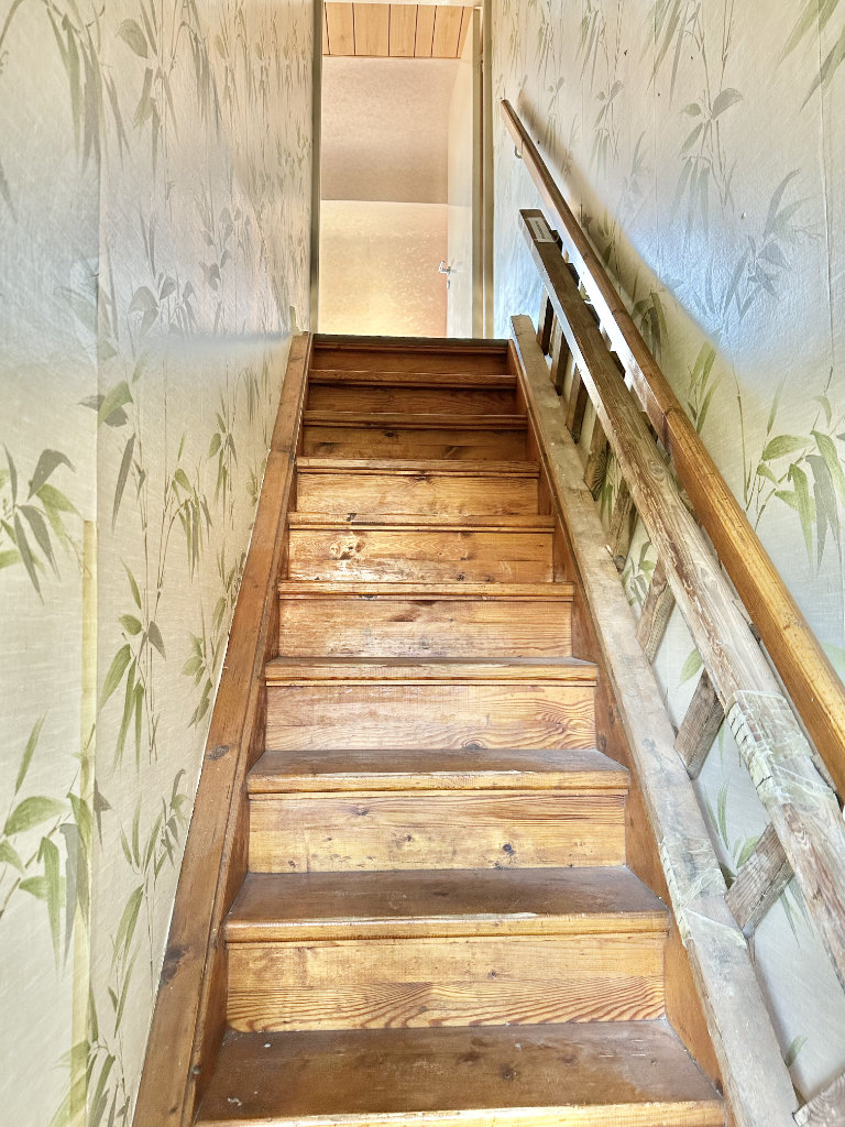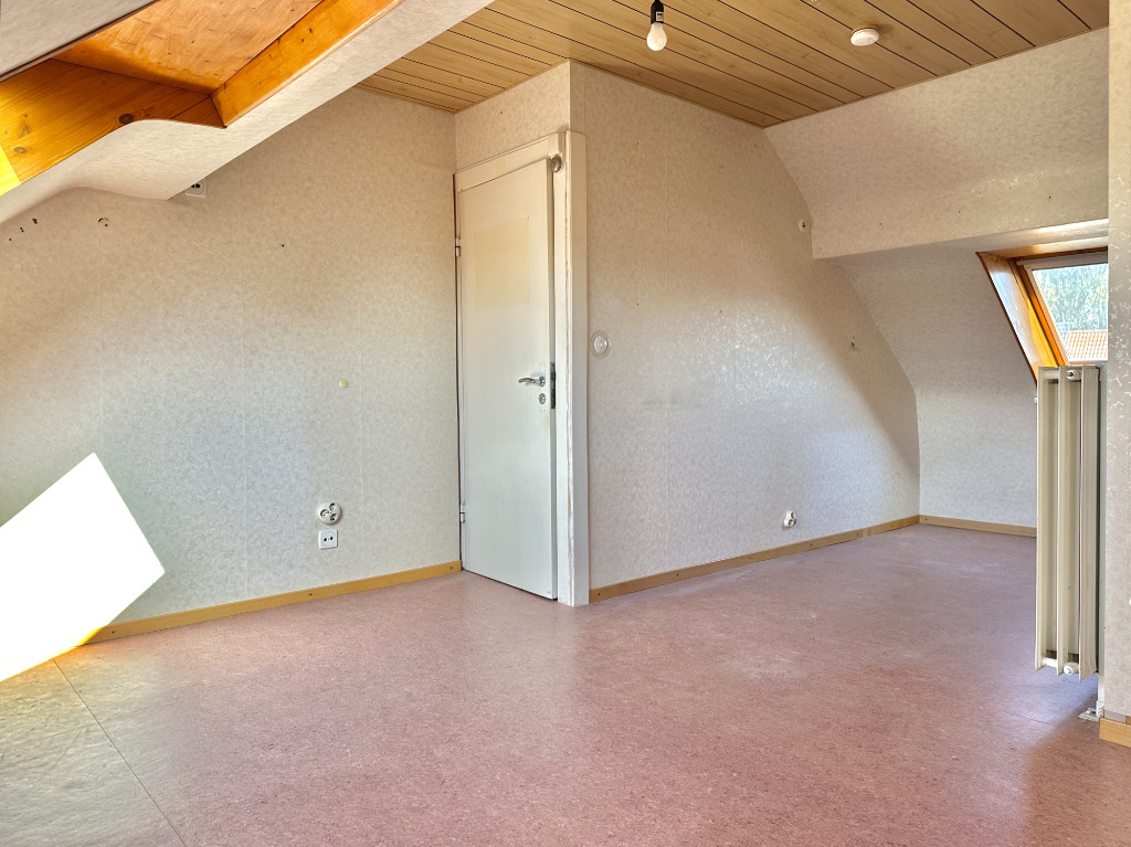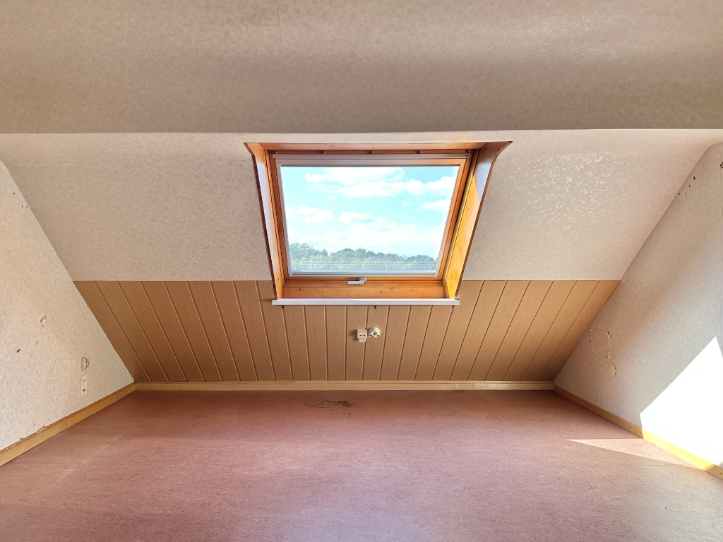Das andere Zimmer liegt zur Eingangsseite und verfügt über einen Aufgang zum ausgebauten Dachgeschoss, mit zusätzlicher Nutzfläche. Dieses wird durch zwei Dachschrägenfenster angenehm mit Tageslicht erhellt und bietet ausreichend Platz als Rückzugsort für Gäste oder Teenager.
