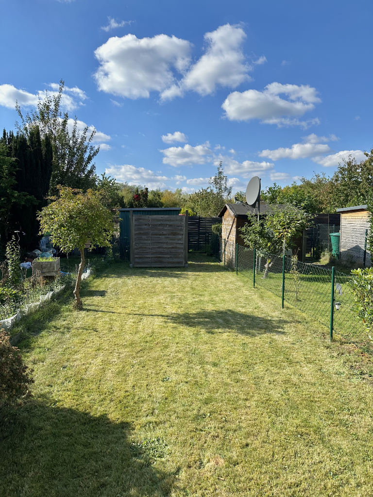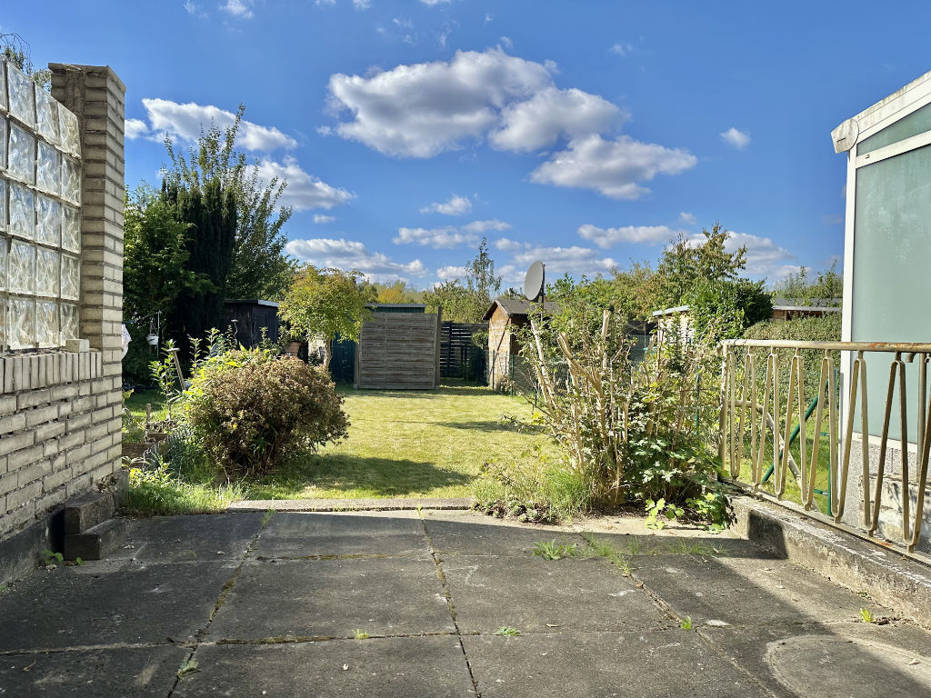 Das Schlafzimmer liegt zur Gartenseite, mit unverbauter Sicht ins Grüne des angrenzenden Kleingartenvereins.