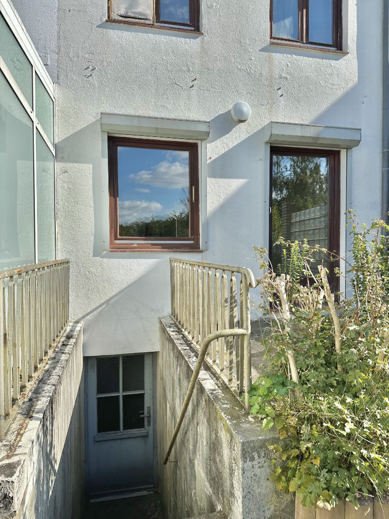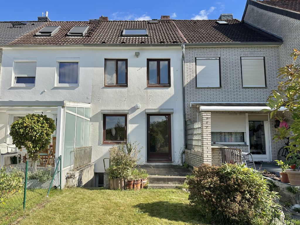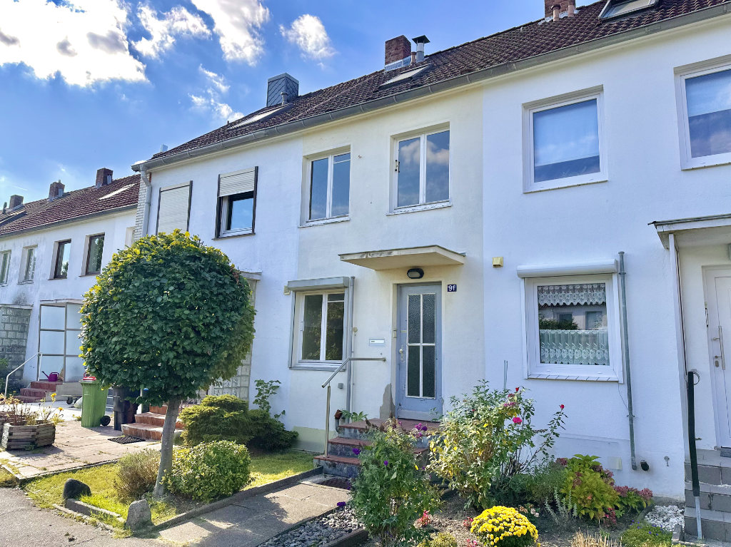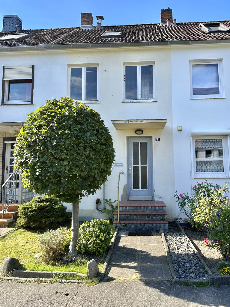 Die gepflegte Reihenhauszeile wurde im Jahr 1955 errichtet und ist voll unterkellert. Durch den kleinen pflegeleicht angelegten Vorgarten gelangt man zum Eingang, der durch ein Vordach vor Regen geschützt ist.