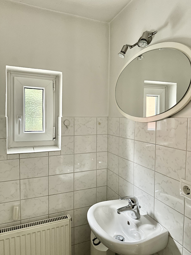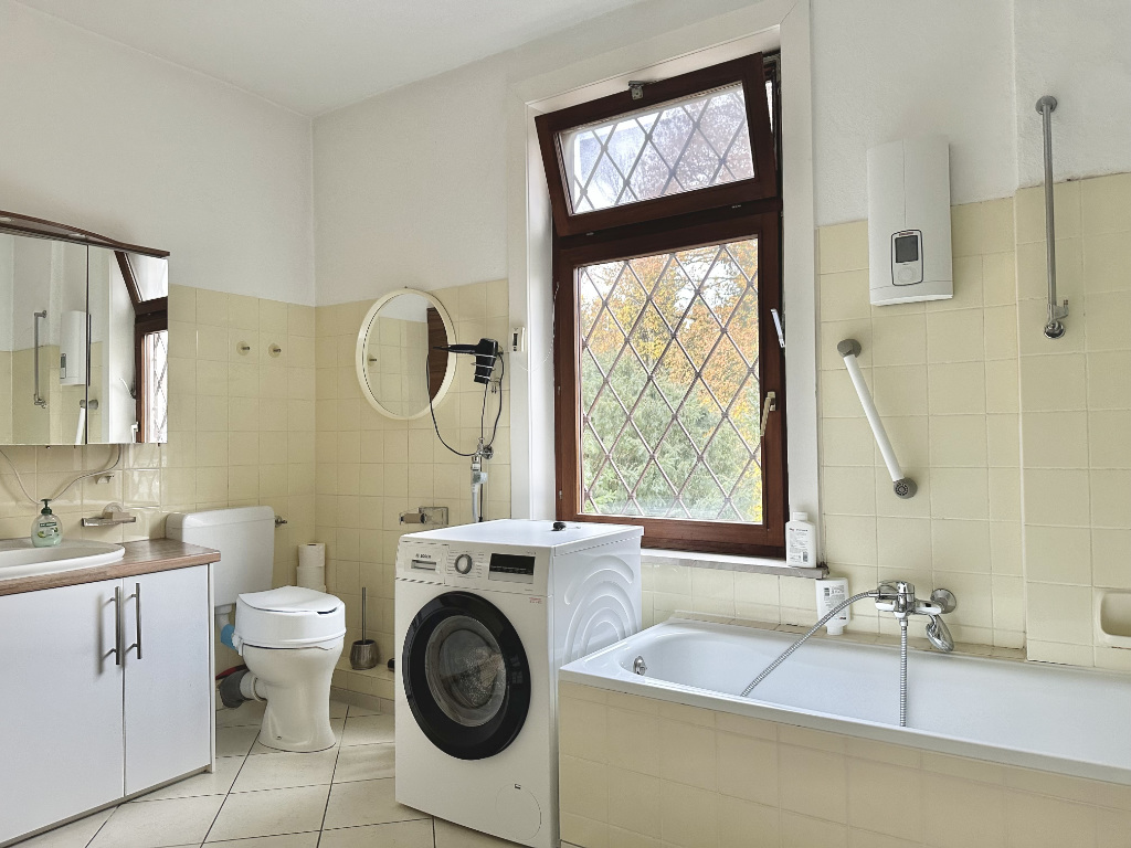Das Badezimmer verfügt über eine Badewanne. Ein großes Fenster versorgt dieses Bad mit Tageslicht.