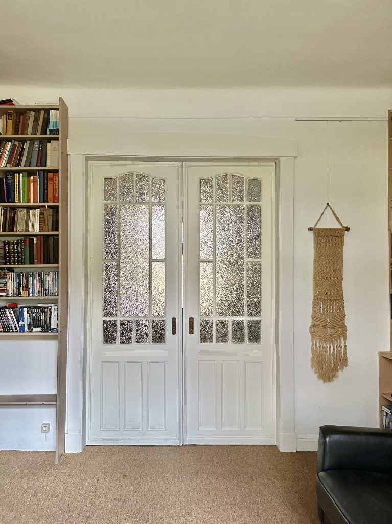 Von der edlen Diele gelangt man in den Wohn-/Essbereich mit einer wunderschönen zweiflügeligen Schiebetür, durch deren Glaselemente Tageslicht ebenso wie Kerzenschein schimmert.
