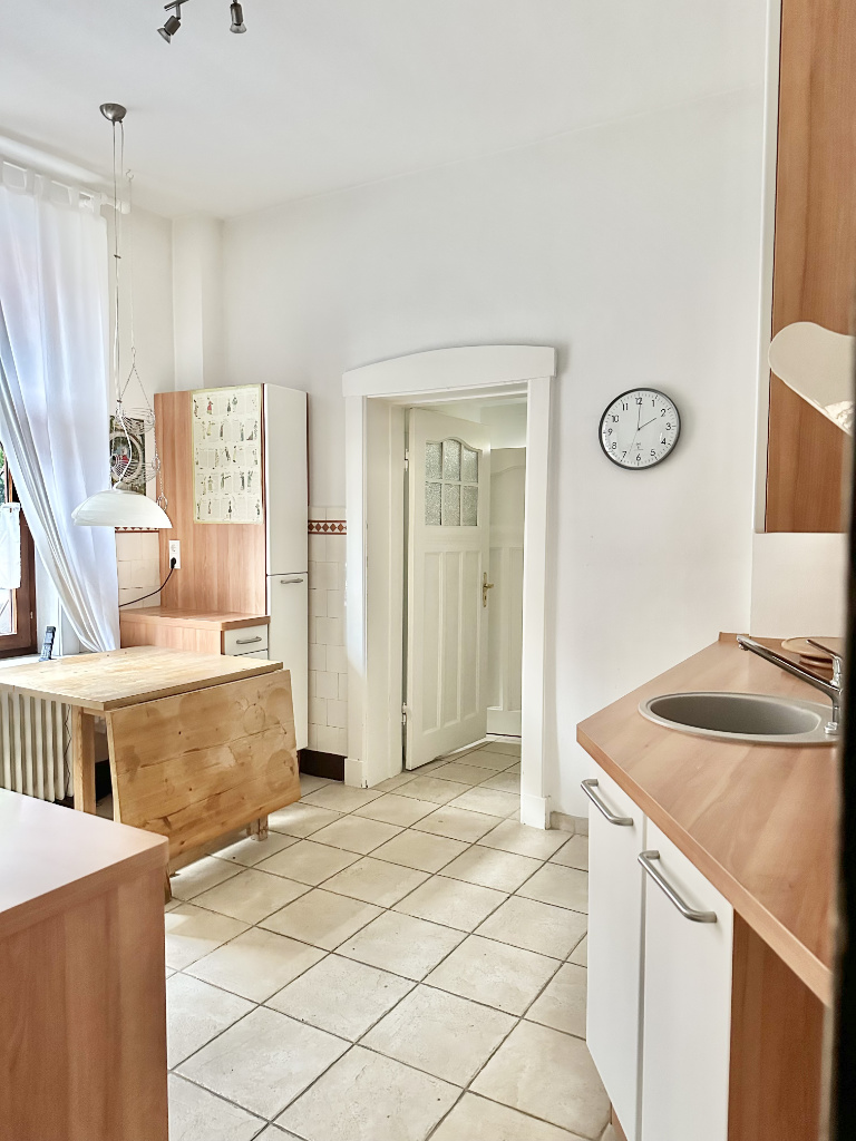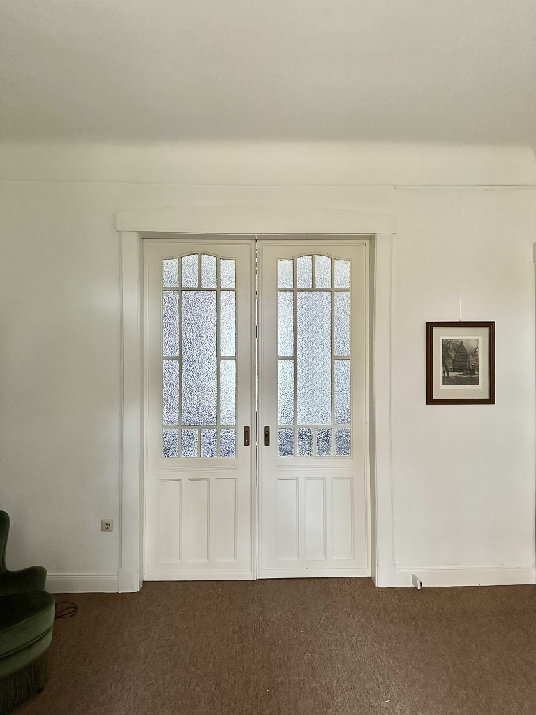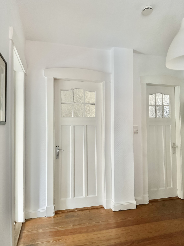 Der Flur dieser Etage besticht mit vier strahlendweißen Zimmertüren und -rahmen im Jugendstil. Ein ungemein einnehmender Anblick. Zudem finden wir auch hier eine außerordentliche Deckenhöhe von 2,75 Metern vor.