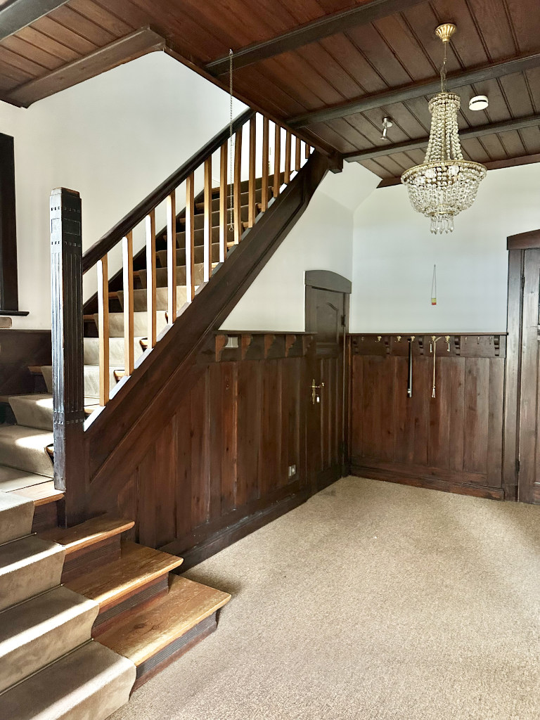 Eine breite Treppe aus teils verziertem Holz führt zum Obergeschoss mit 3 Schlafzimmern und einem Badezimmer.