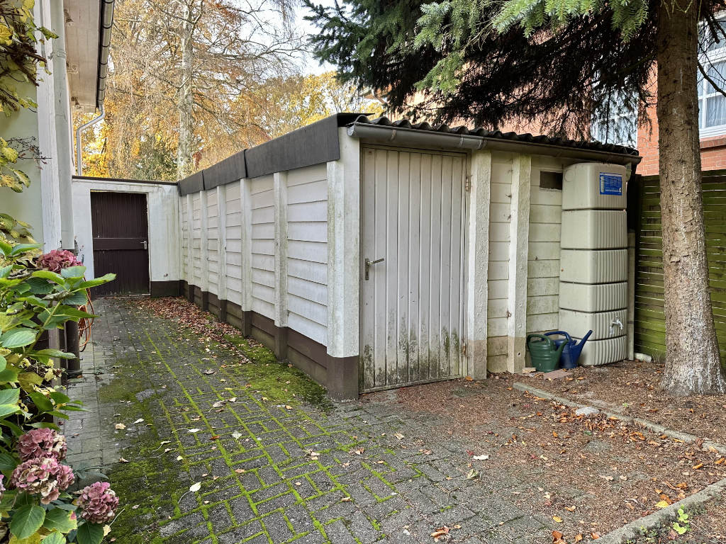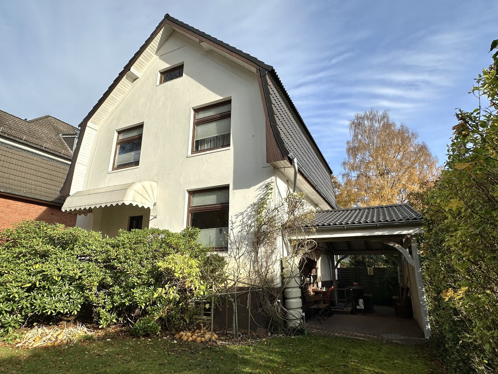 Durch den großen sonnigen Vorgarten gelangt man zum wettergeschützten Eingang des Hauses und die daneben befindliche Garage. Der Garten hinter dem Haus ist von hier nicht einsehbar.