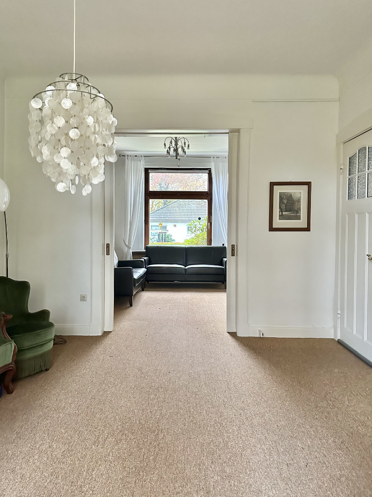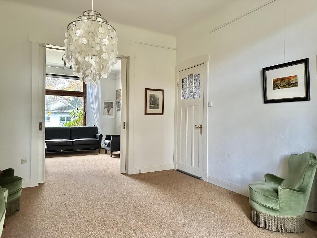 Das Haus empfängt seine Gäste in einer großzügigen Diele mit hölzerner Wandvertäfelung aus dem Baujahr. Auch die Zimmertüren und -rahmen sind mit Verzierungen im Jugendstil versehen. Die Decken dieses Geschosses sind teils mit dekorativen Rosetten versehen und messen gut 3 Meter.