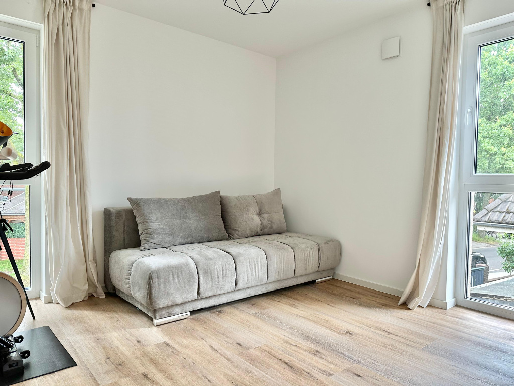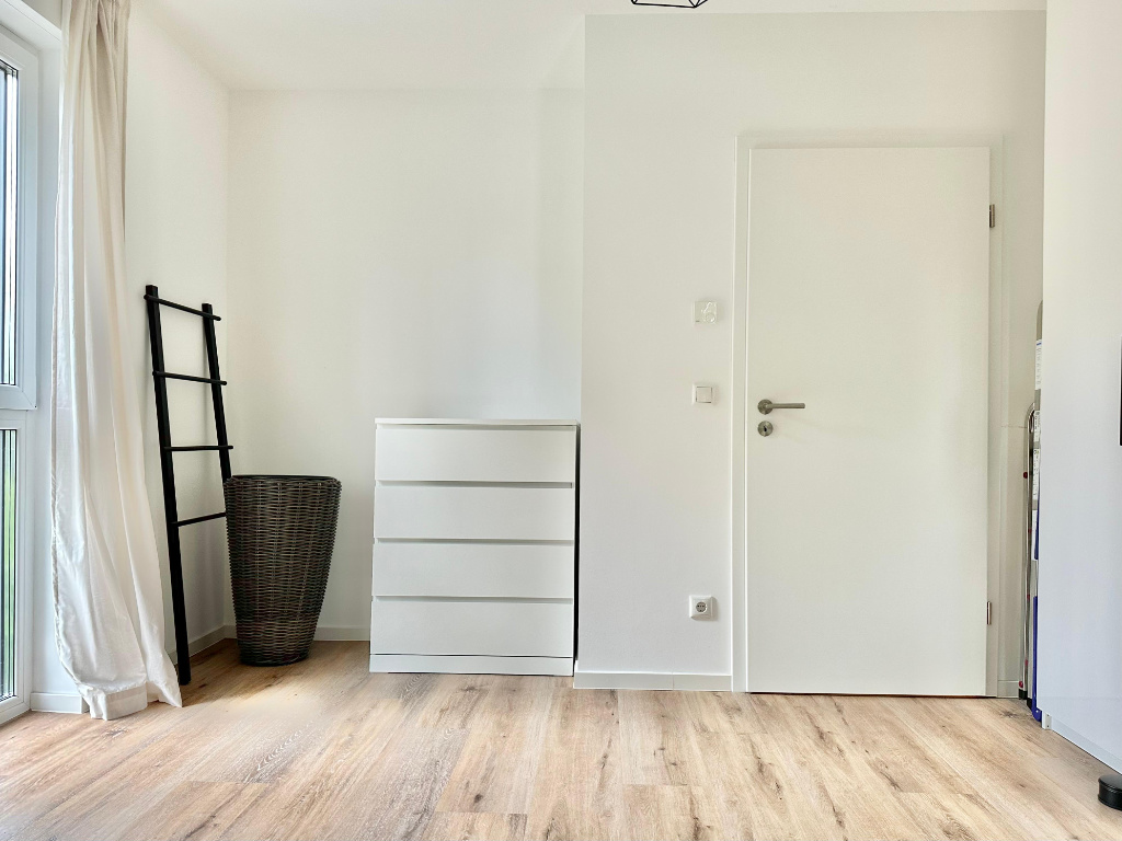 Daneben ist das Kinderzimmer in das von zwei Seiten durch ebenfalls bodentiefe Fenster viel Tageslicht einfällt. Dieser Raum ist auch ideal als Arbeits- oder Gästezimmer zu nutzen.