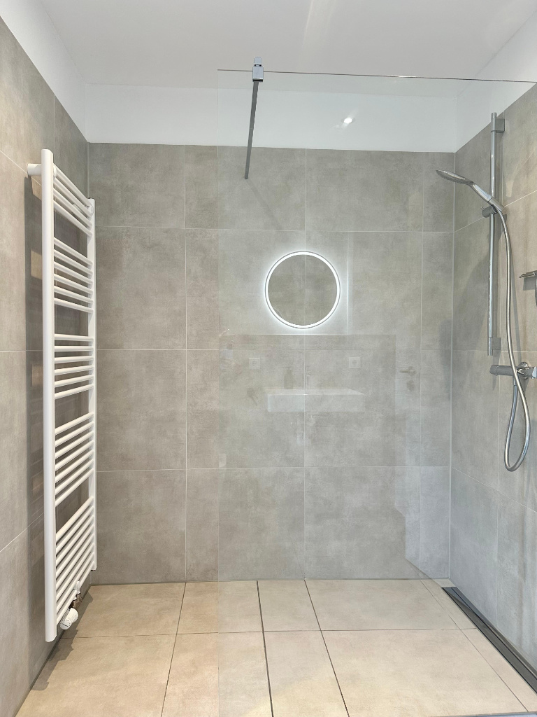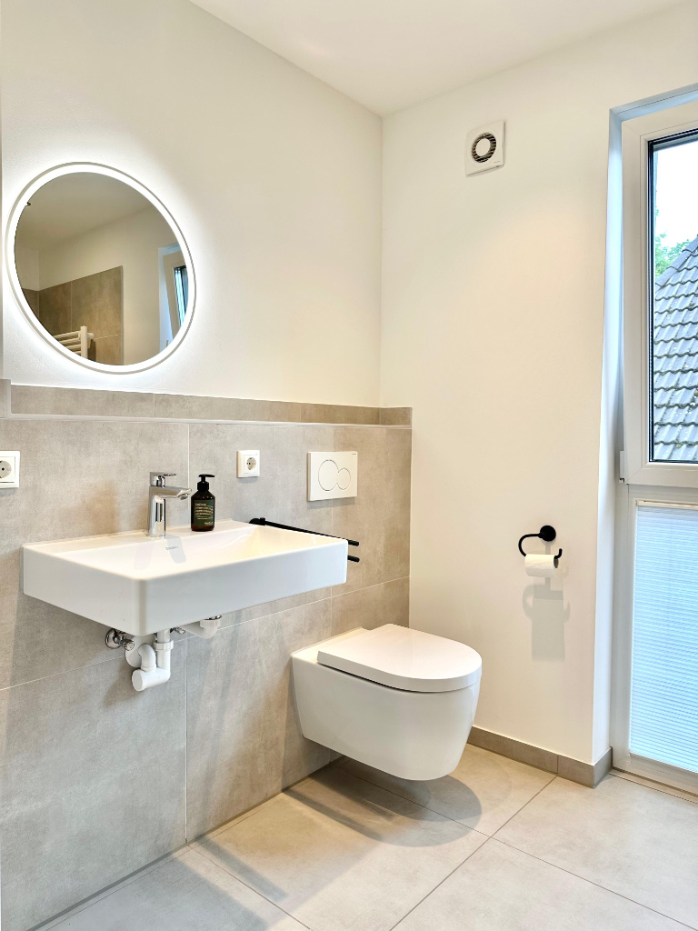 Geradeaus führt die Diele in das Badezimmer mit einem bodentiefen Fenster. Es ist edel mit hellgrauen Wand- und Bodenfliesen in Betonoptik und weißen Sanitärobjekten ausgestattet. Besonders schön ist die große, ebenerdige Dusche mit einer Glasabtrennung.