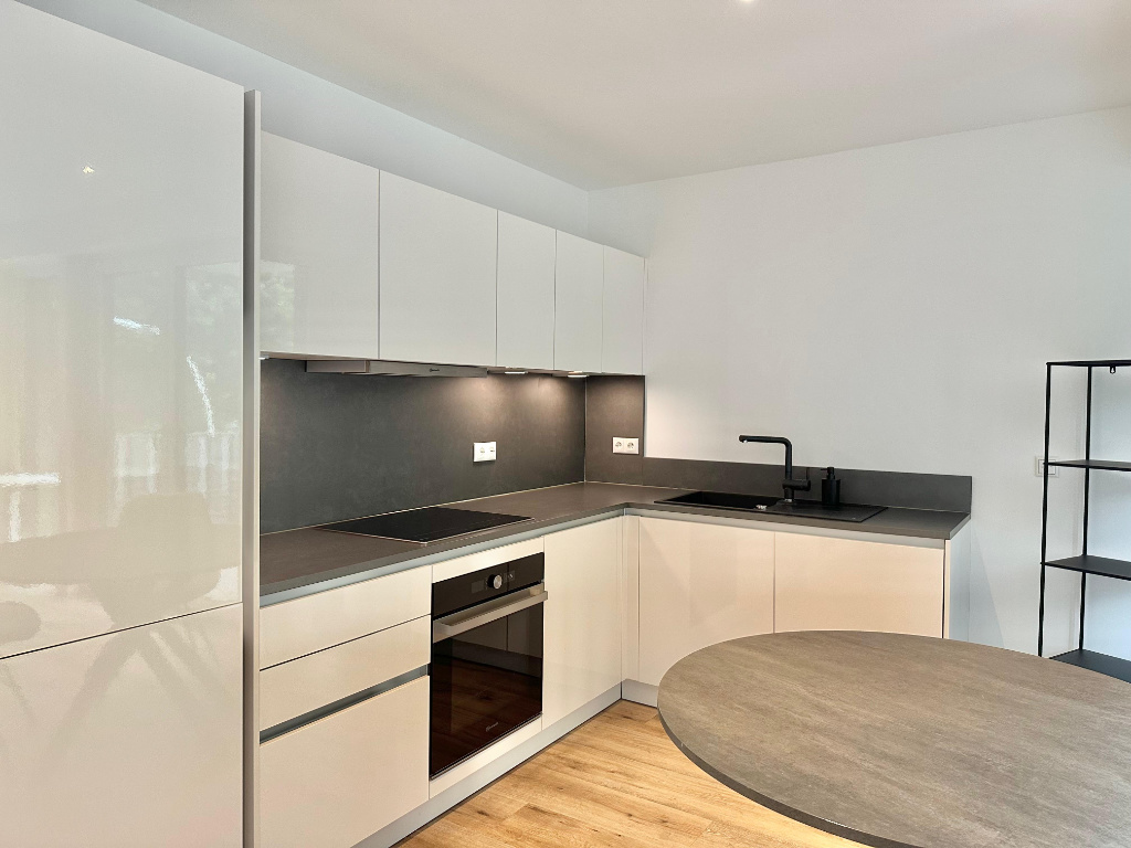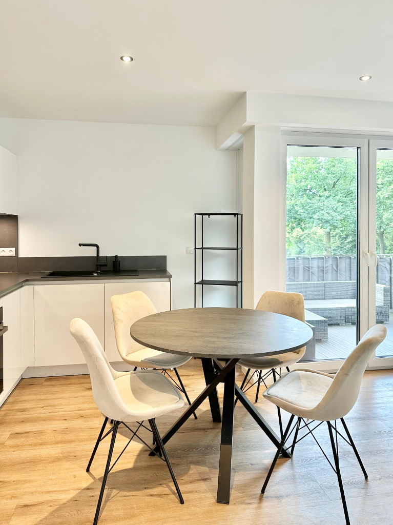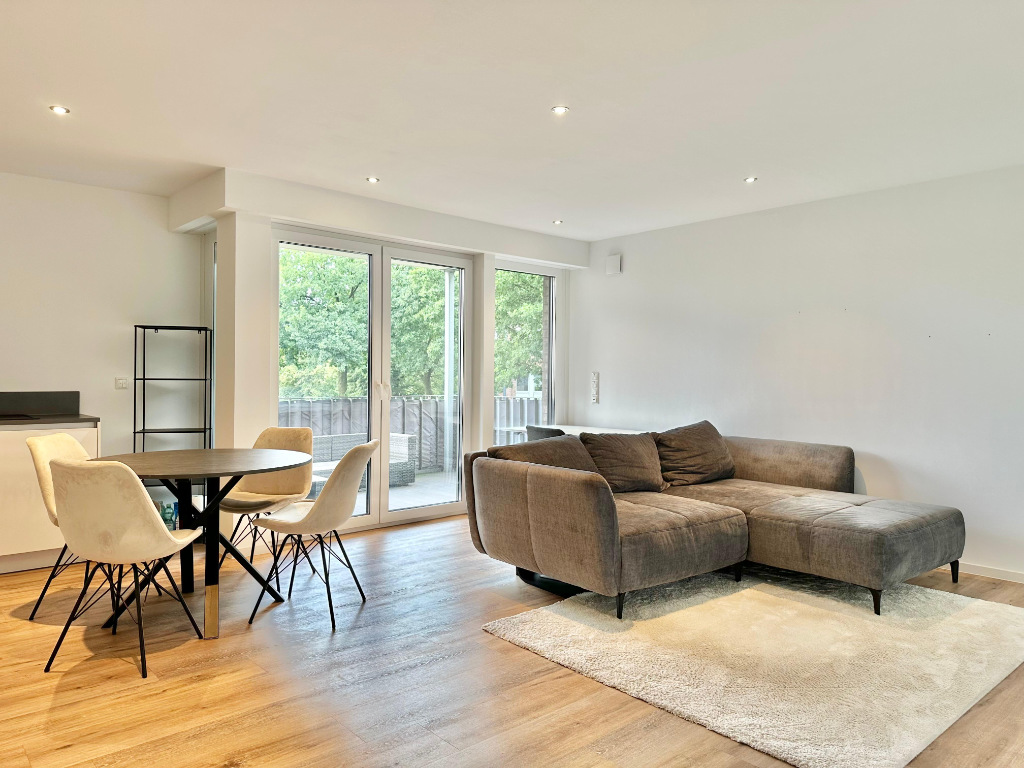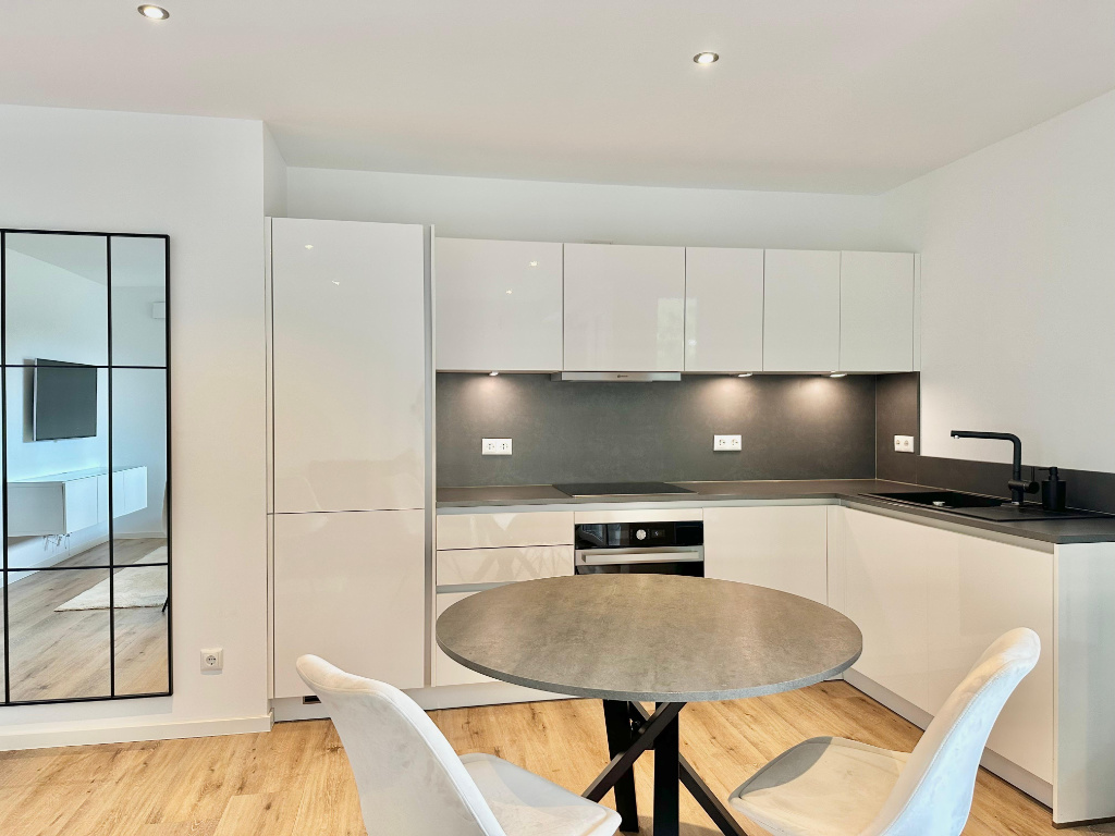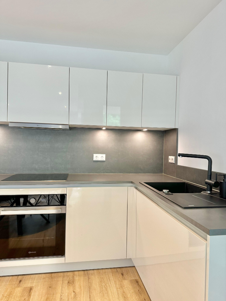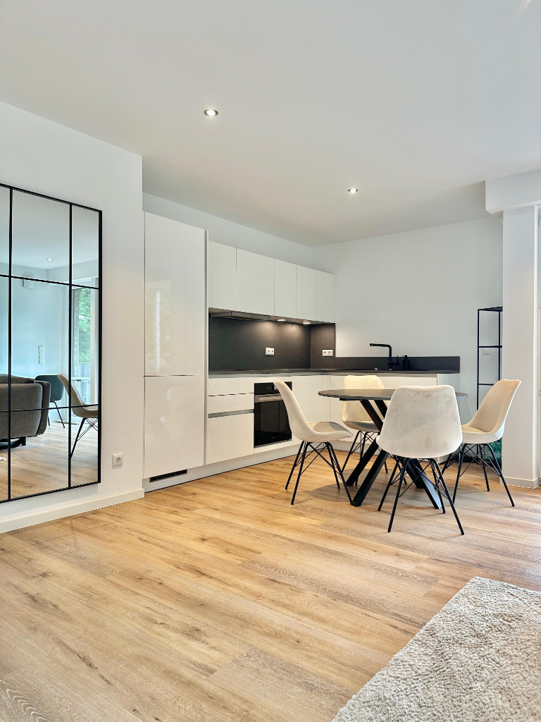 Zur linken Seite liegt das große Wohnzimmer mit offener Küche. Diese ist mit Einbauschränken in Hochglanz-weißausgestattet. Die dunklen Arbeitsplatten setzen einen schönen Akzent. Davor ist ausreichend Platz für einen Essbereich.