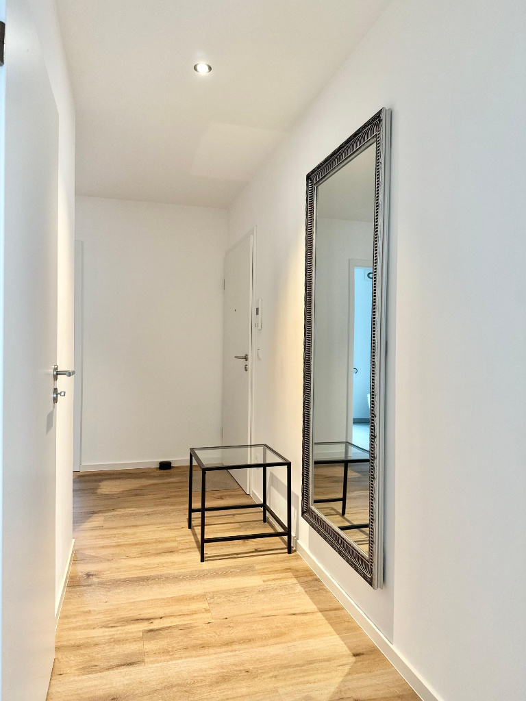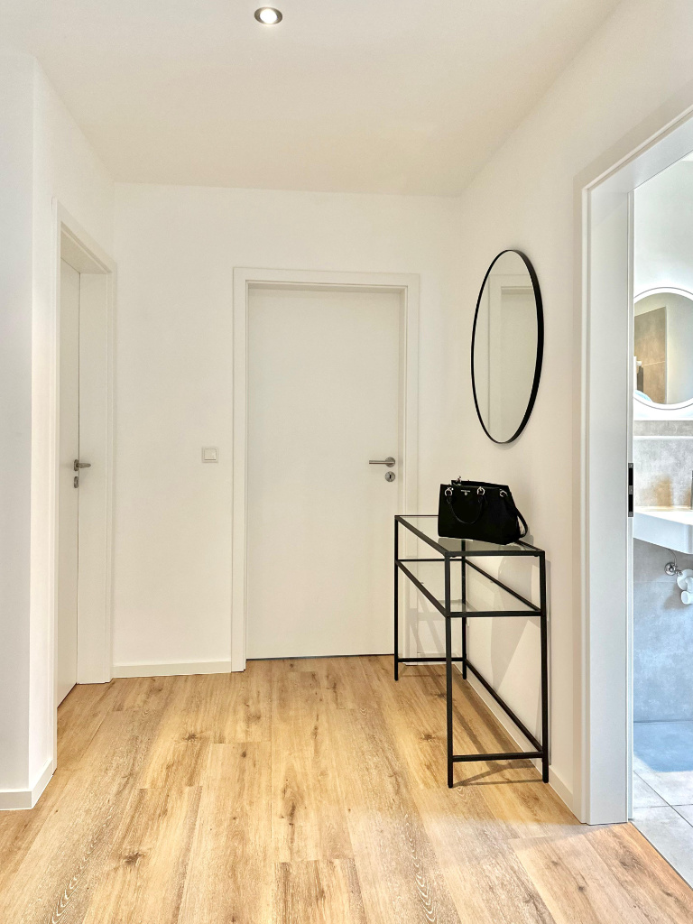 Der Flur wird durch Deckeneinbaustrahler angenehm ausgeleuchtet und bietet viel Platz für eine Garderobe.